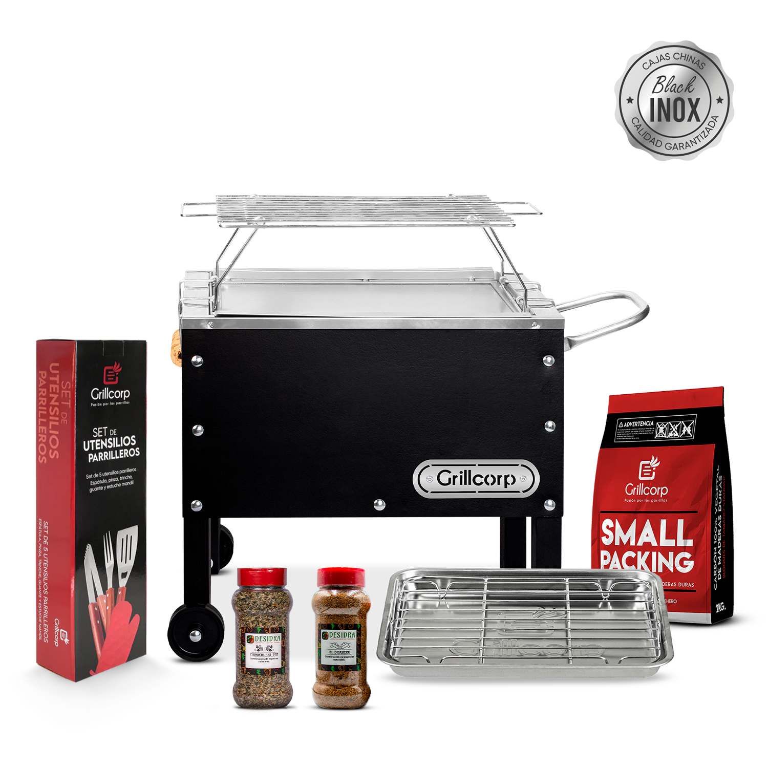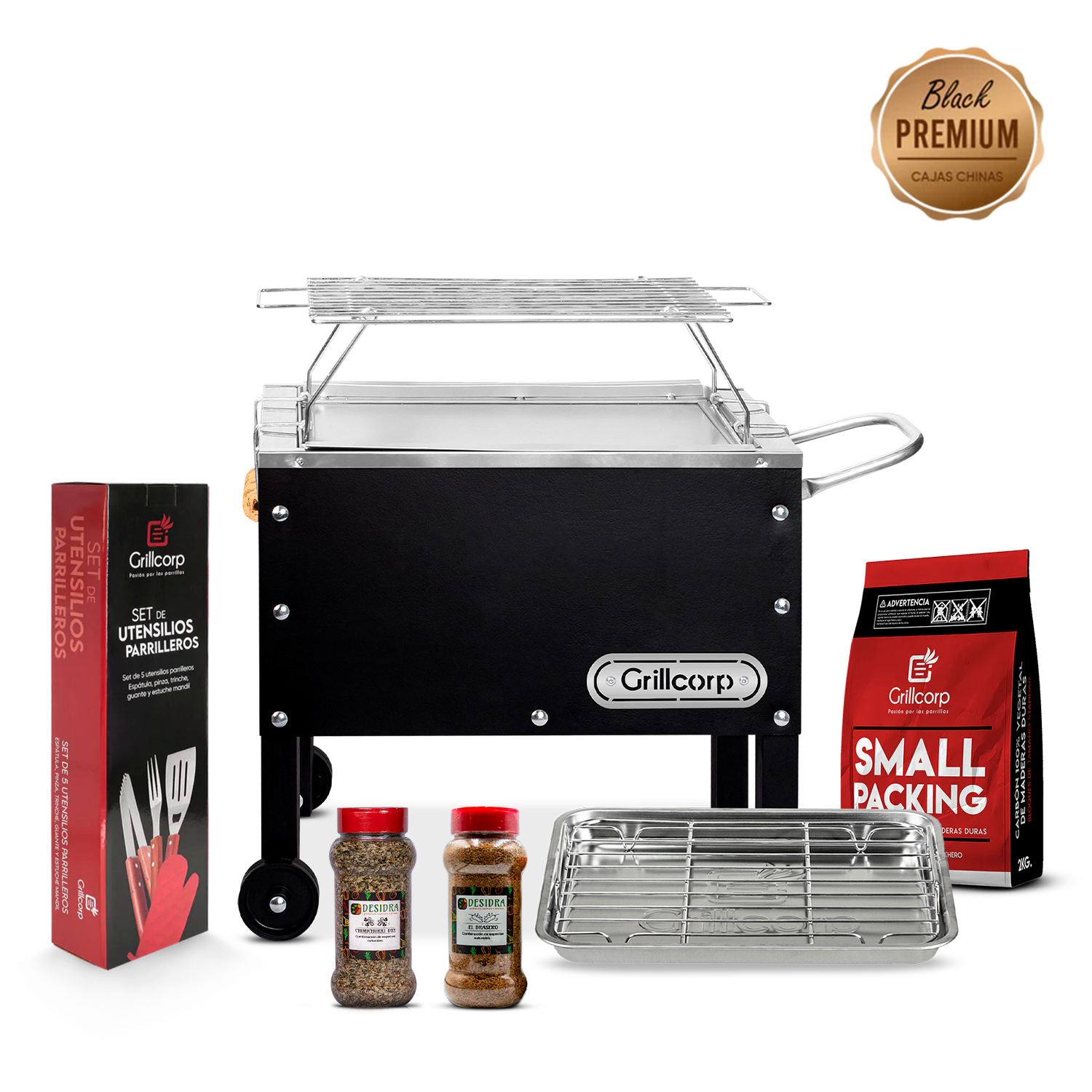 Caja China Chica Black Premium con Parrilla de Varillas Inoxidables + Accesorios Parrilleros | Grillcorp