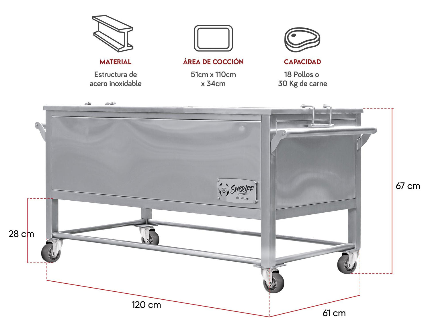 '- Incluye: carbón de 10kg, Bandeja para jugos y Rejilla para carnes de acero inoxidable, atizador de fierro y guantes de Nitrilo.