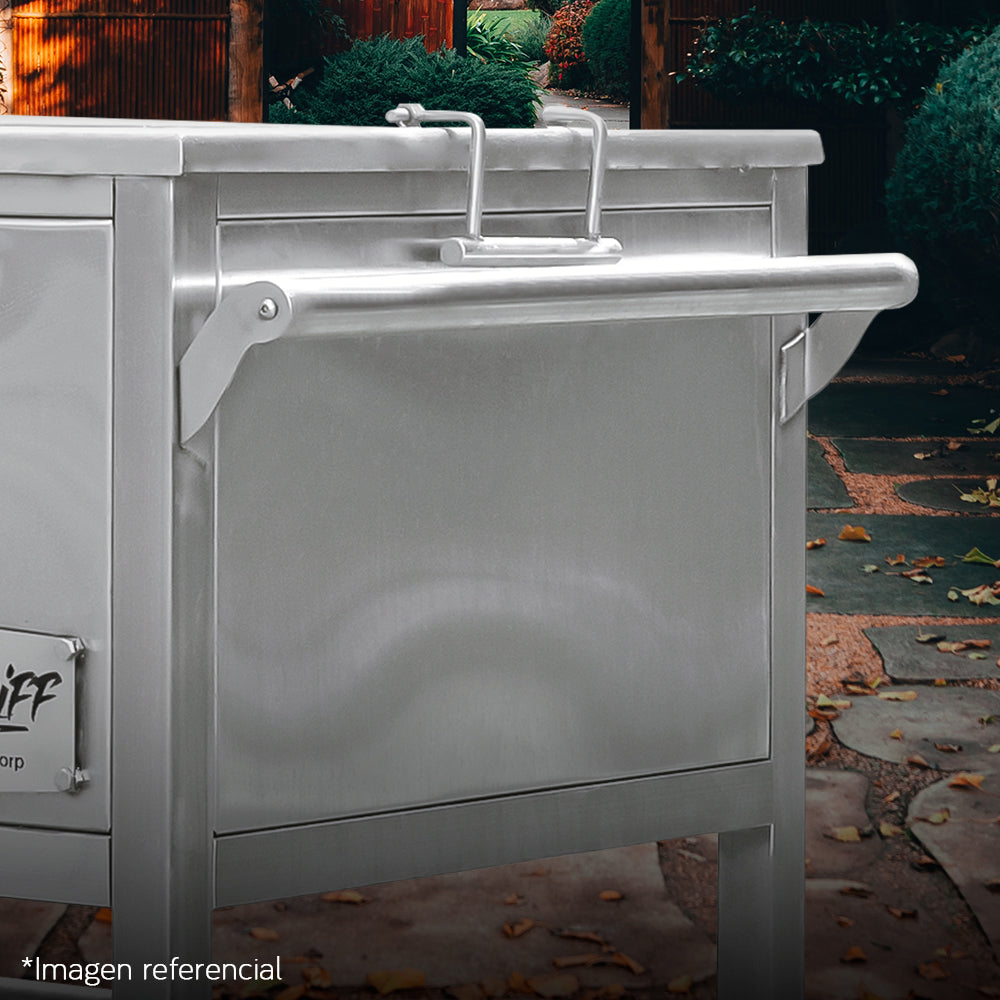 '- Incluye: carbón de 10kg, Bandeja para jugos y Rejilla para carnes de acero inoxidable, atizador de fierro y guantes de Nitrilo.