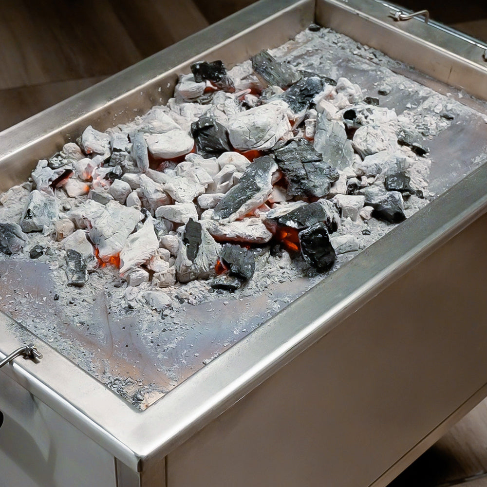 La bandeja para carbón de nuestra caja china está fabricada de acero galvanizado y reforzada con ángulos de fierro para mayor resistencia.