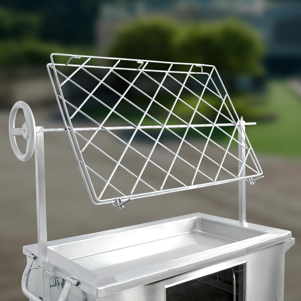 Pero eso no es todo: cuenta con un sistema de asado vertical tipo libro, ajustable y elevable mediante un timón, que te permite asar costillares, lechones, pollos enteros o cortes grandes de manera uniforme y controlada, dominando el fuego desde todos los ángulos.