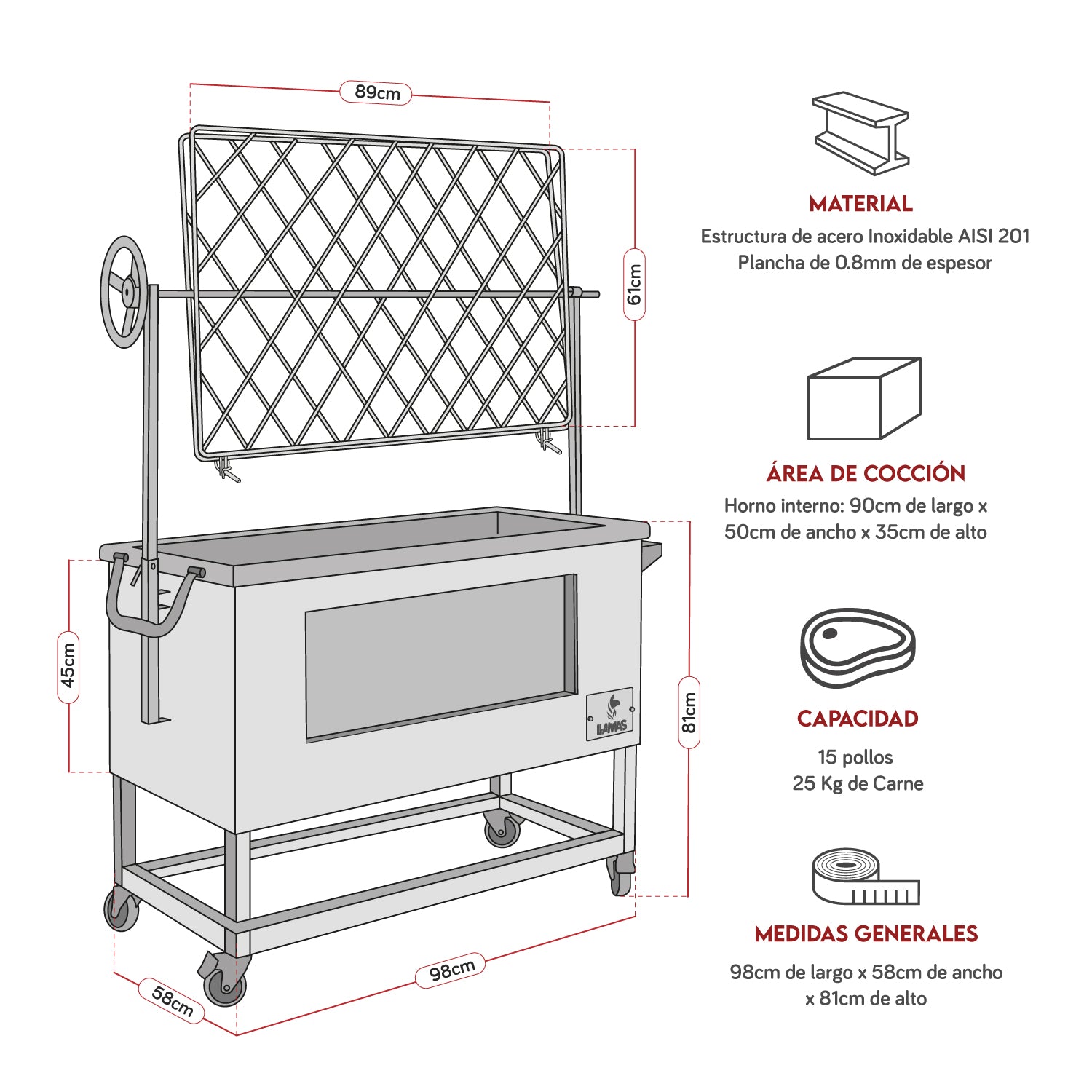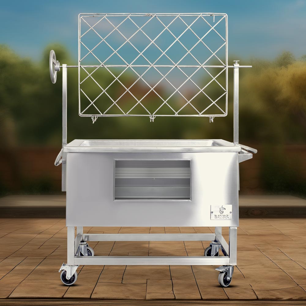 Construida 100% en acero inoxidable AISI 201, esta caja es resistente a la corrosión, fácil de limpiar y pensada para durar años en entornos exigentes, desde parrilladas familiares hasta para negocios. Las ruedas industriales con freno y su asa resistente que facilitan su transporte, mientras que su estructura inferior ofrece estabilidad y espacio extra para utensilios o carbón.