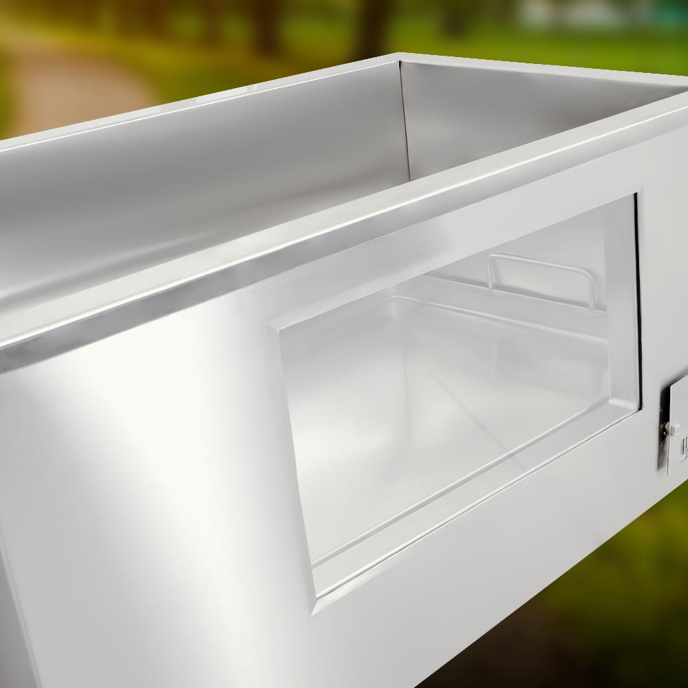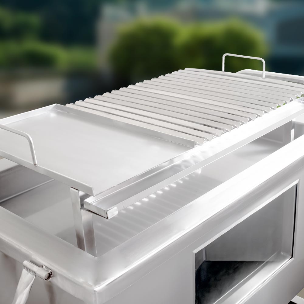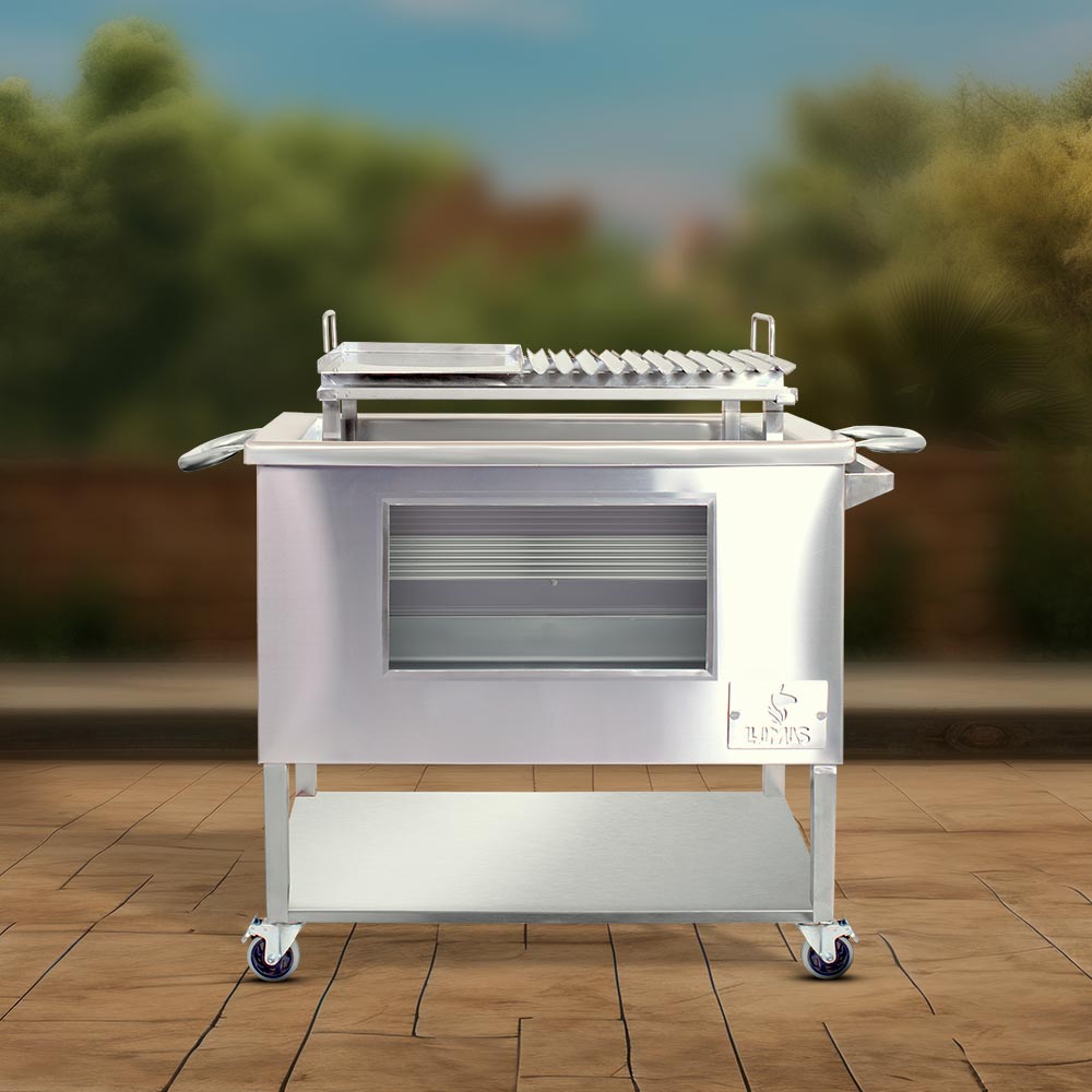Construida 100% en acero inoxidable AISI 201, esta caja es resistente a la corrosión, fácil de limpiar y pensada para durar años en entornos exigentes, desde parrilladas familiares hasta para negocios. Las ruedas industriales con freno y su asa resistente que facilitan su transporte, mientras que su estructura inferior ofrece estabilidad y espacio extra para utensilios o carbón.