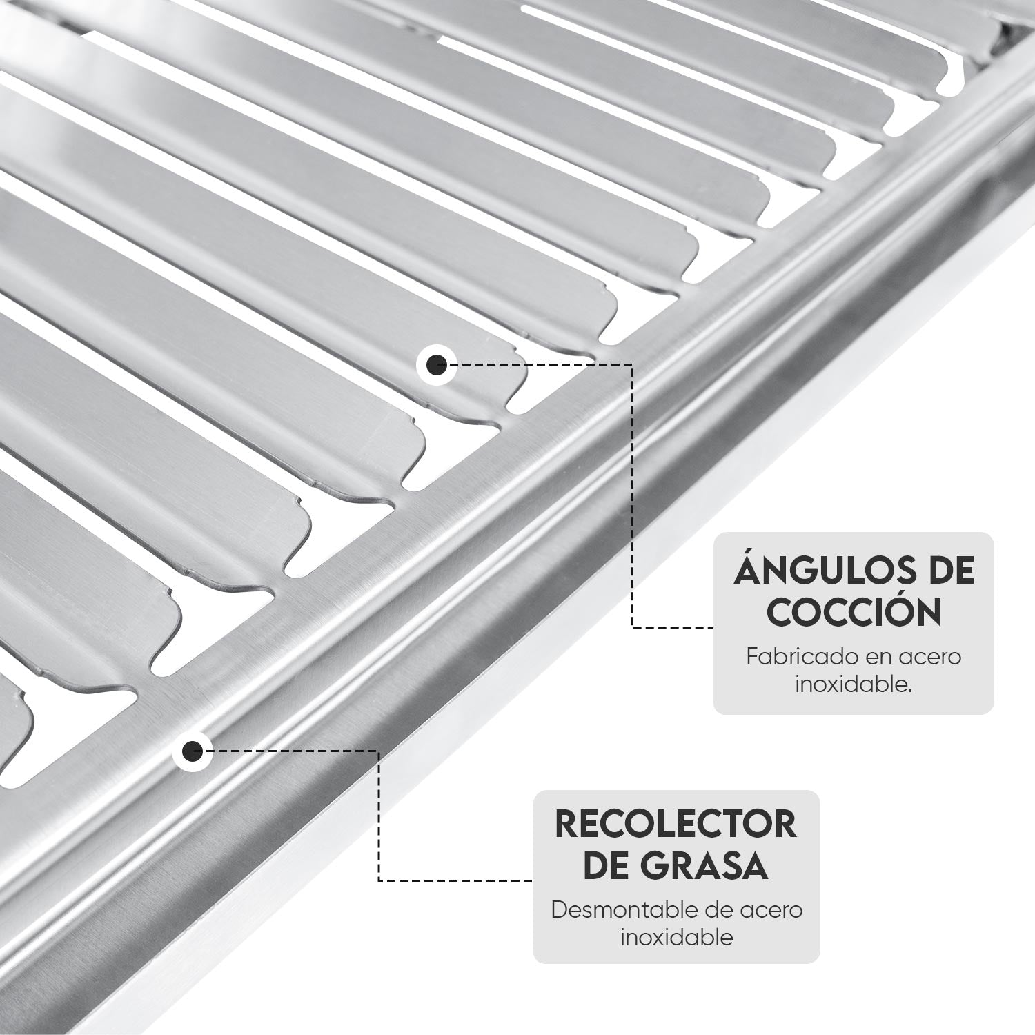 - Bandeja para carnes y de Jugos: Acero Inoxidable.