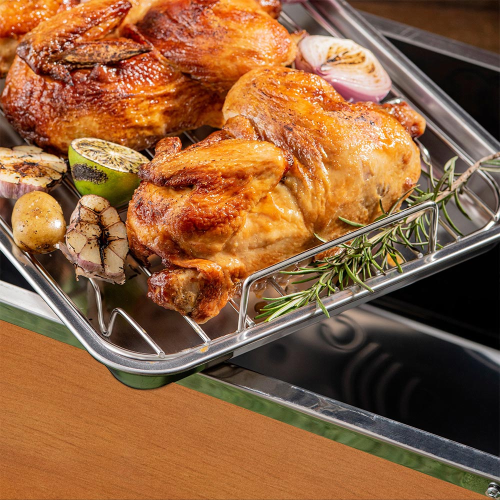 Coloque sus carnes en la parrilla de acero inoxidable y deje que los jugos se acumulen en la bandeja de jugo de acero inoxidable, para que sus comidas no pierdan sabor y permanezcan jugosas.
