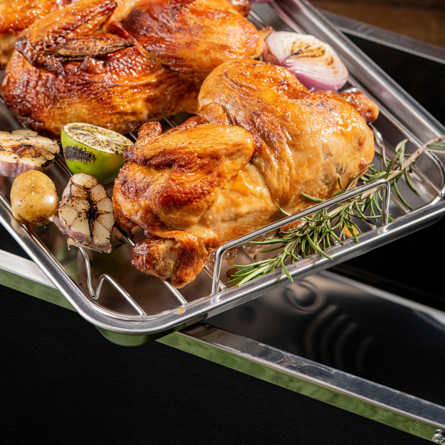 Coloque sus carnes en la rejilla de acero inoxidable y deje que los jugos se acumulen en la bandeja de acero inoxidable, para que sus comidas no pierdan sabor y permanezcan jugosas y con un aroma único.