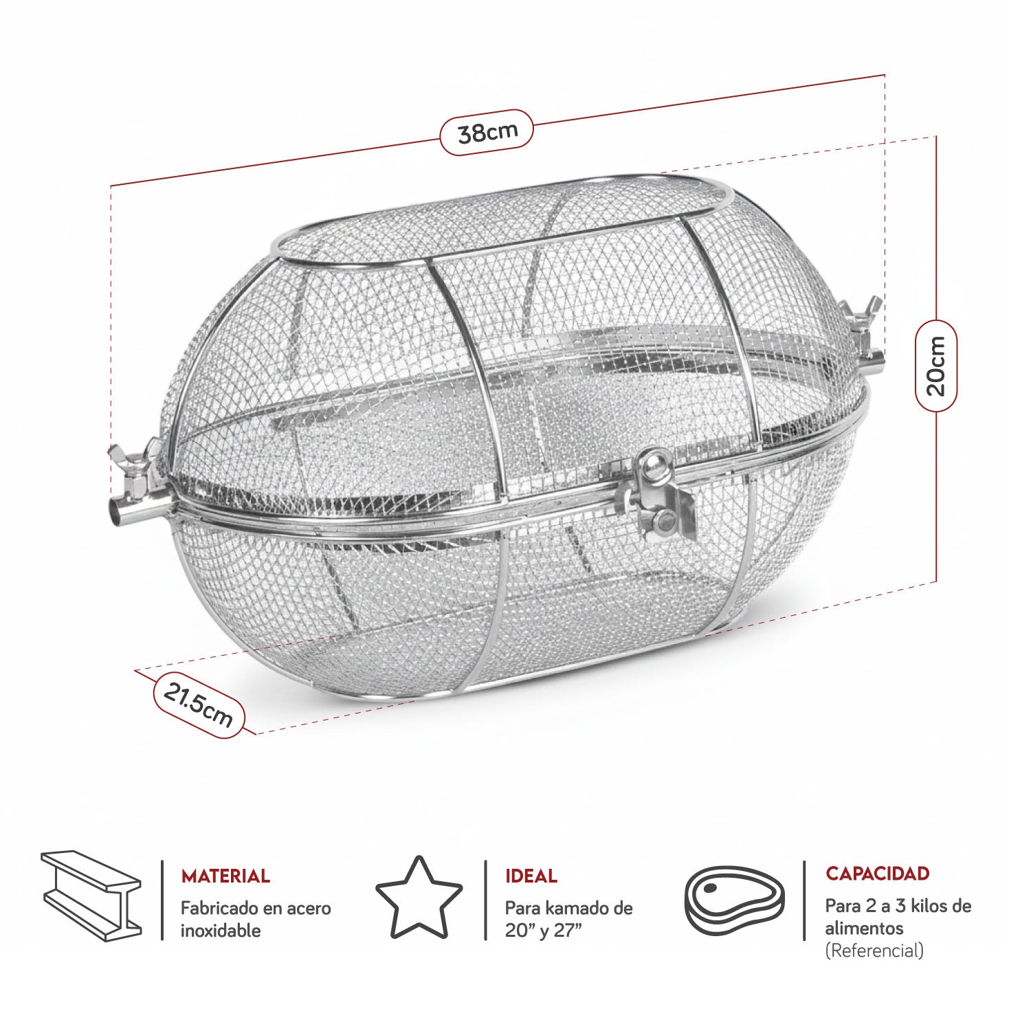 Descubre una nueva forma de cocinar con la Canasta para Rostizar en Kamado, el accesorio definitivo para los amantes de las brasas que buscan perfección en cada bocado. Diseñada con una malla de acero inoxidable de alta calidad, esta canasta permite que el calor y el humo circulen libremente, logrando ese acabado crujiente y ahumado que solo un Kamado puede ofrecer.