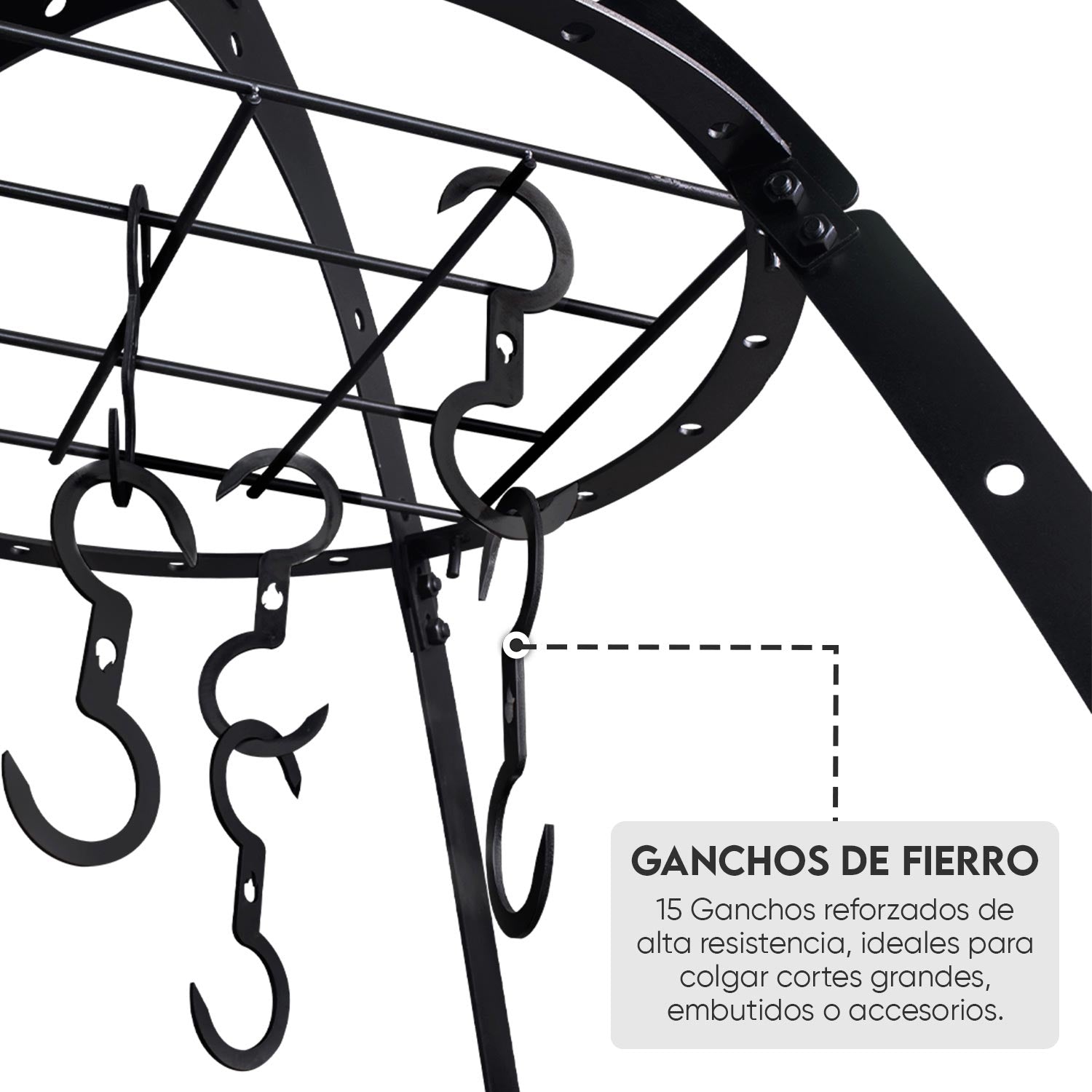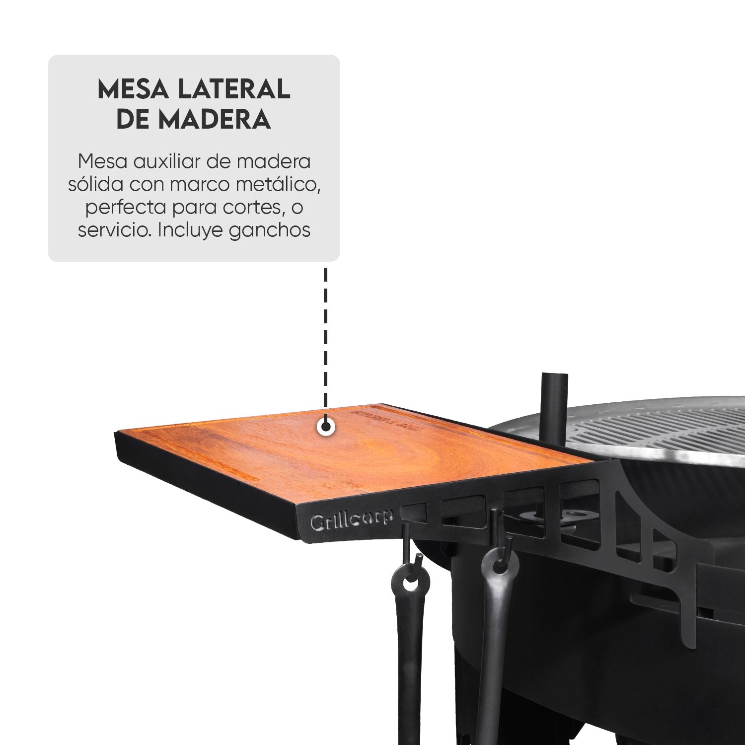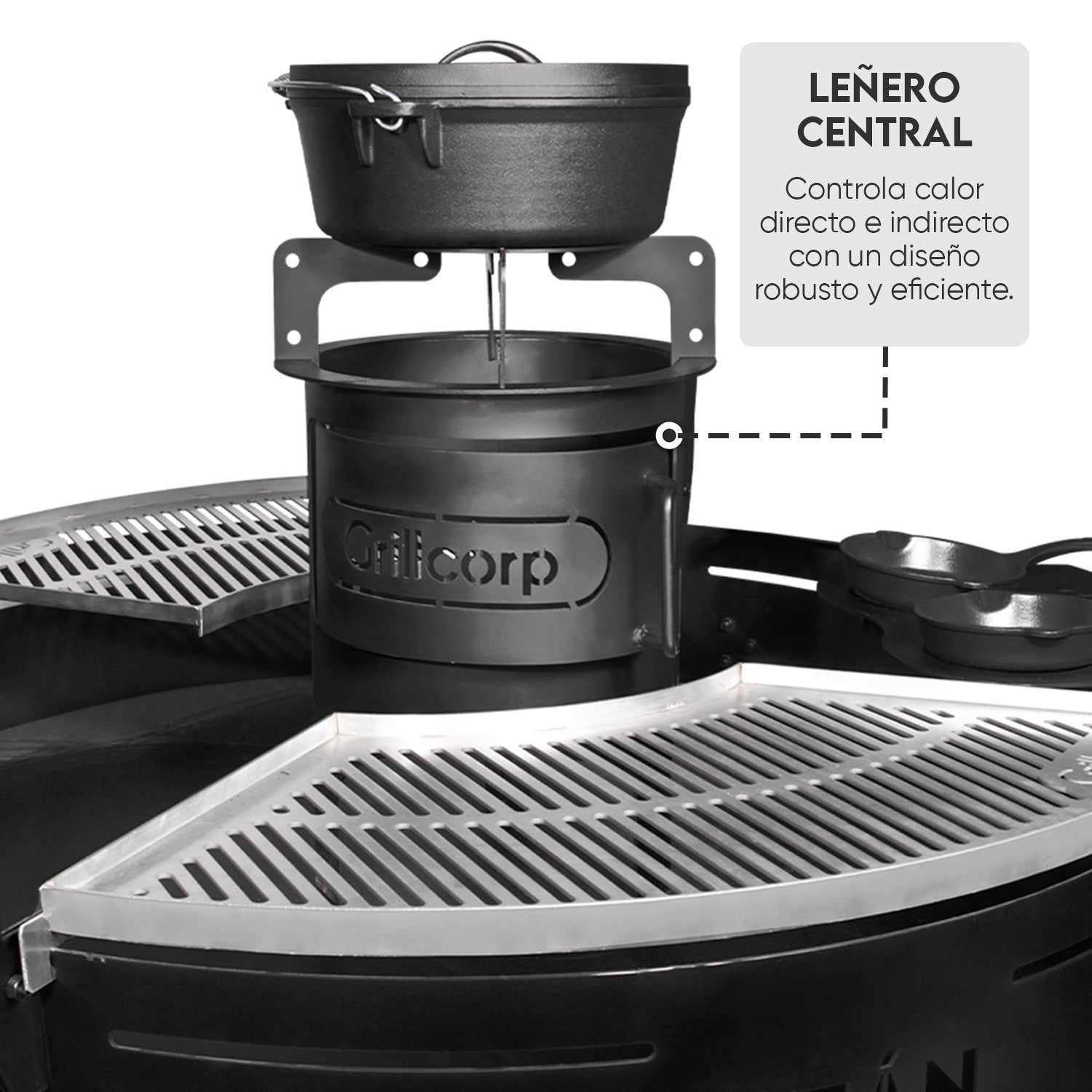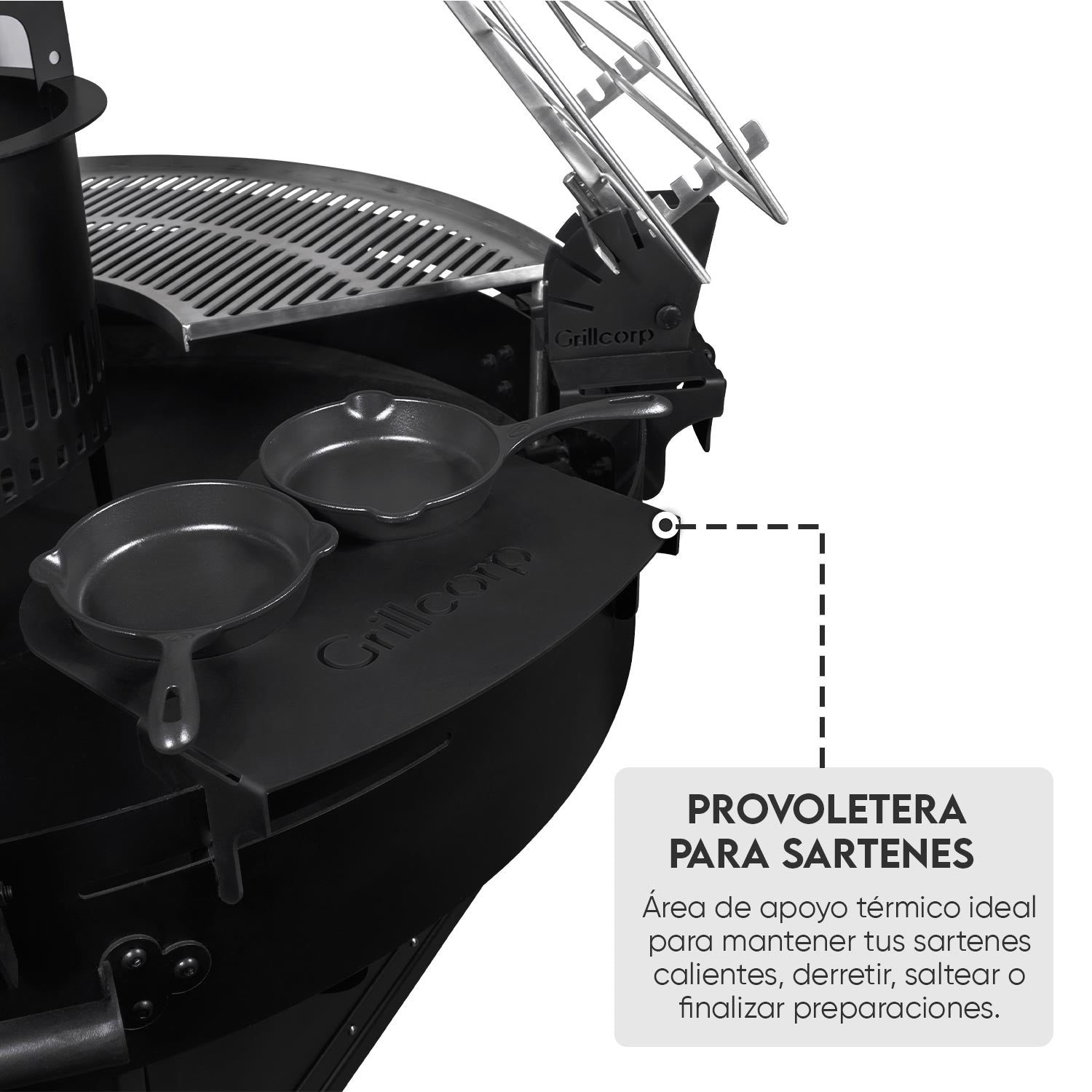 Base con ruedas, brasero, parrilla movible media luna de acero inoxidable, estaca tipo libro de 75cm x 50cm, Hornilla para brasero, provoletera doble, 2 sartenes de hierro fundido de 16cm de hierro fundido precurado, pala y atizador de fierro, horno inferior y mástil para espada regulable, 20 ganchos de fierro, Olla de hierro fundido de 6QT y Tabla parrillera chica.