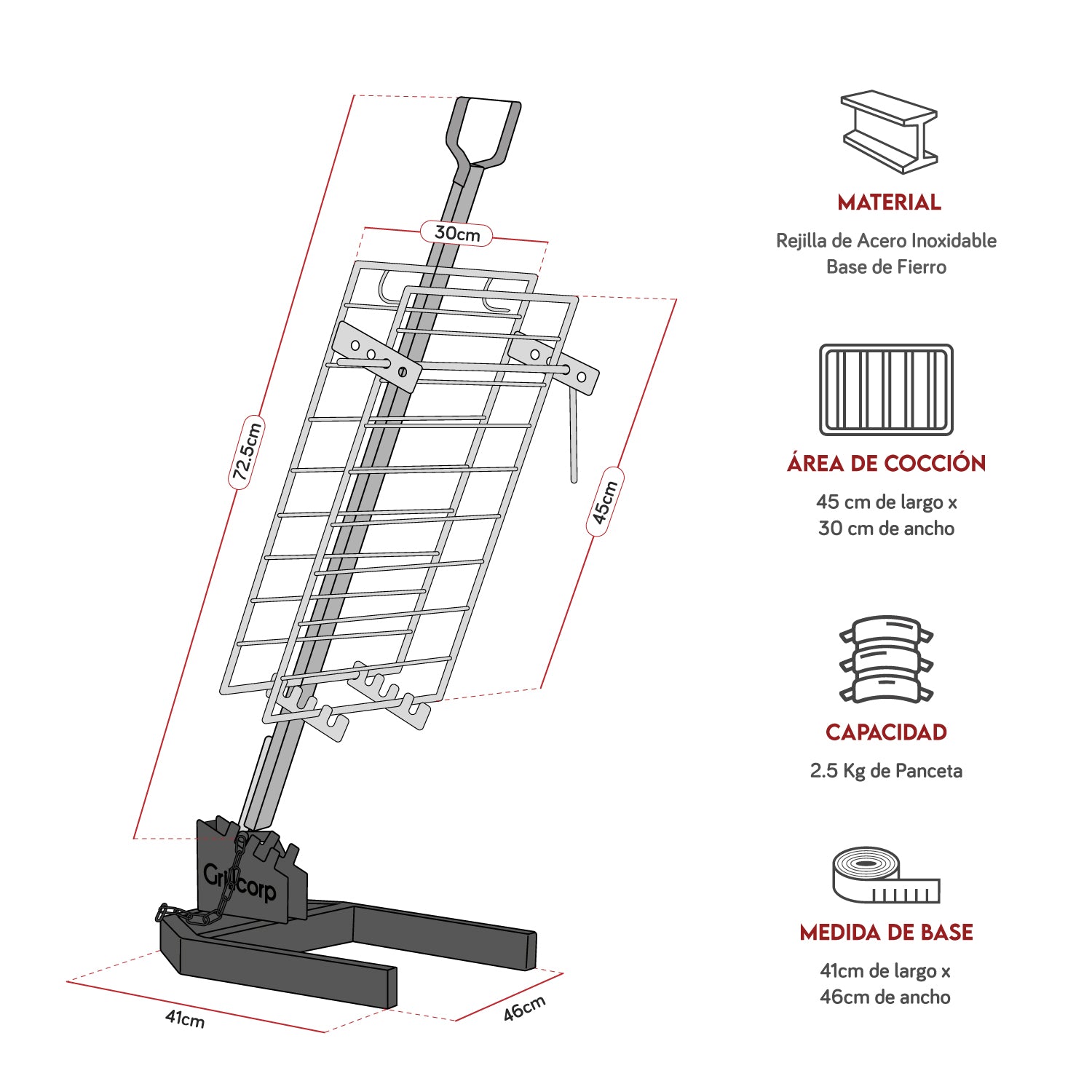 Fabricada en acero inoxidable de alta resistencia, su estructura firme y duradera está pensada para soportar cortes grandes de carne como panceta, costillar o piezas completas de cerdo o cordero. Su base de fierro sólido garantiza estabilidad incluso en terrenos irregulares, permitiendo una cocción uniforme y segura al aire libre.