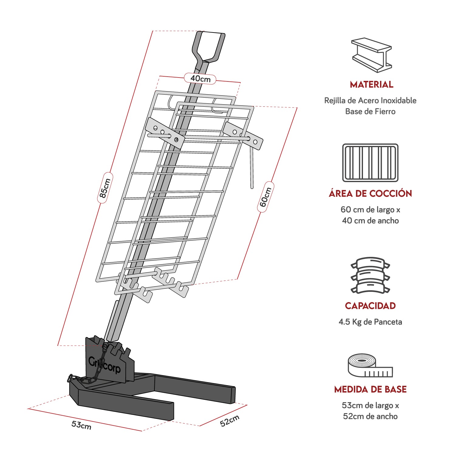 Fabricada en acero inoxidable de alta resistencia, su estructura firme y duradera está pensada para soportar cortes grandes de carne como panceta, costillar o piezas completas de cerdo o cordero. Su base de fierro sólido garantiza estabilidad incluso en terrenos irregulares, permitiendo una cocción uniforme y segura al aire libre.