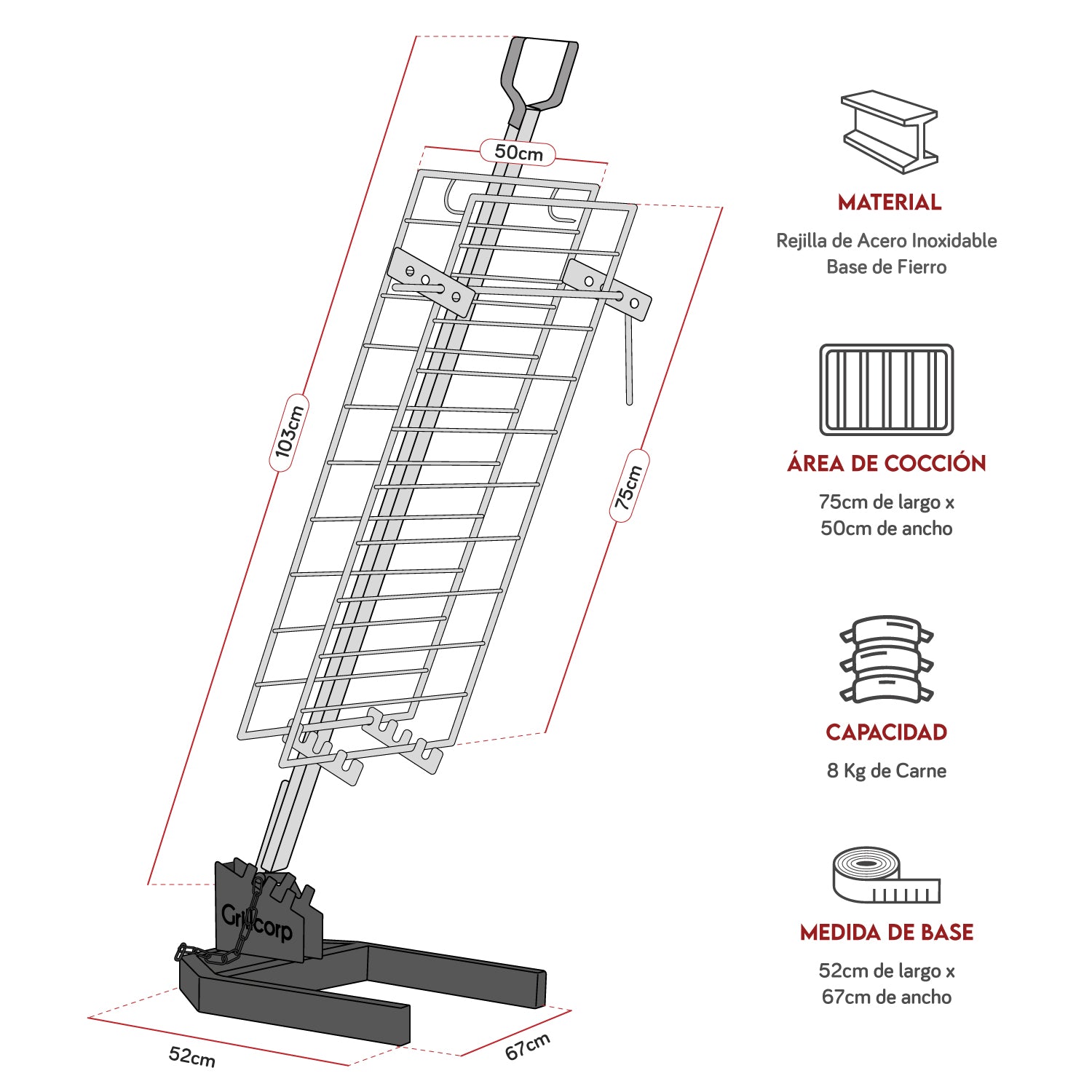Fabricada en acero inoxidable de alta resistencia, su estructura firme y duradera está pensada para soportar cortes grandes de carne como panceta, costillar o piezas completas de cerdo o cordero. Su base de fierro sólido garantiza estabilidad incluso en terrenos irregulares, permitiendo una cocción uniforme y segura al aire libre.