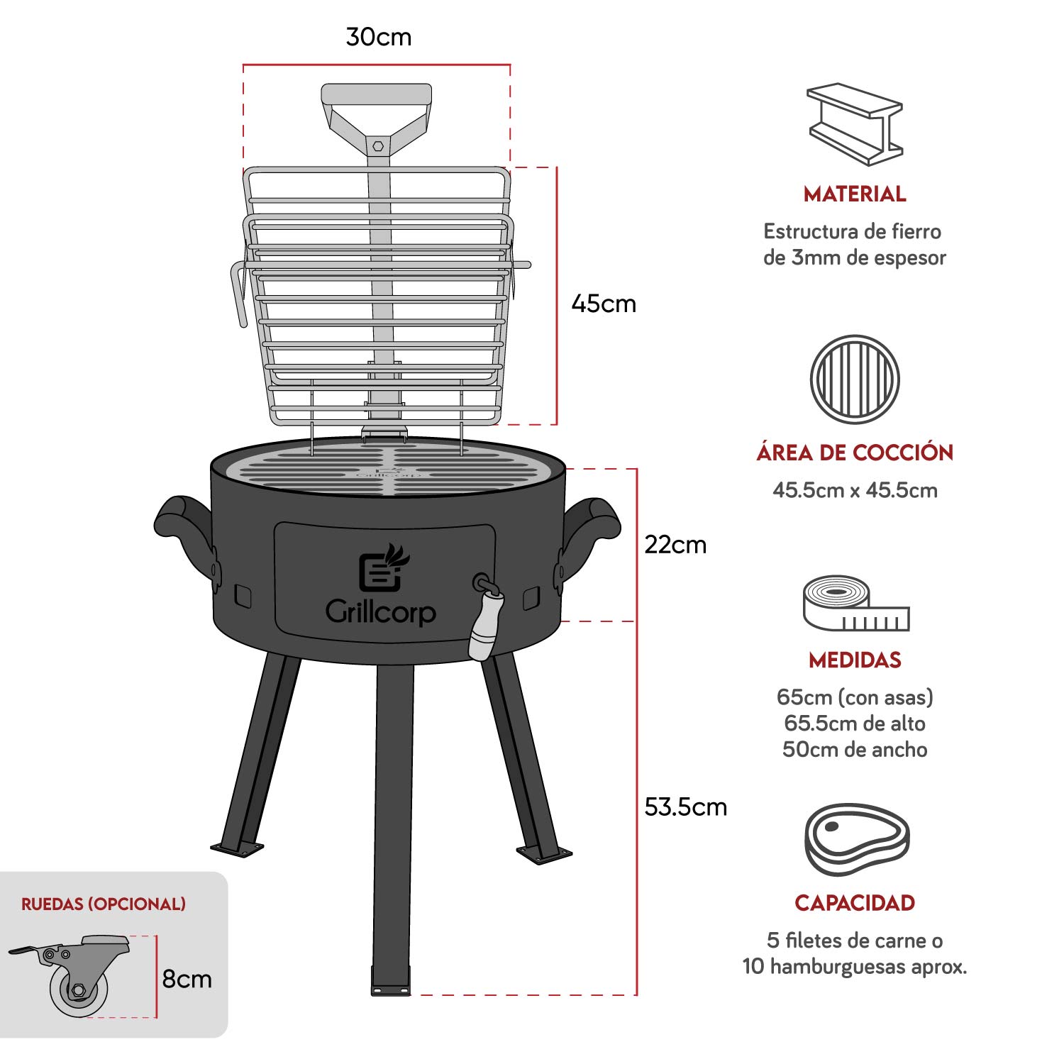'- Incluye: 3 patas de fierro y 2 asas de fierro para ensamblar junto con la parrilla, Pala y atizador, una parrilla principal y una estaca inoxidable.