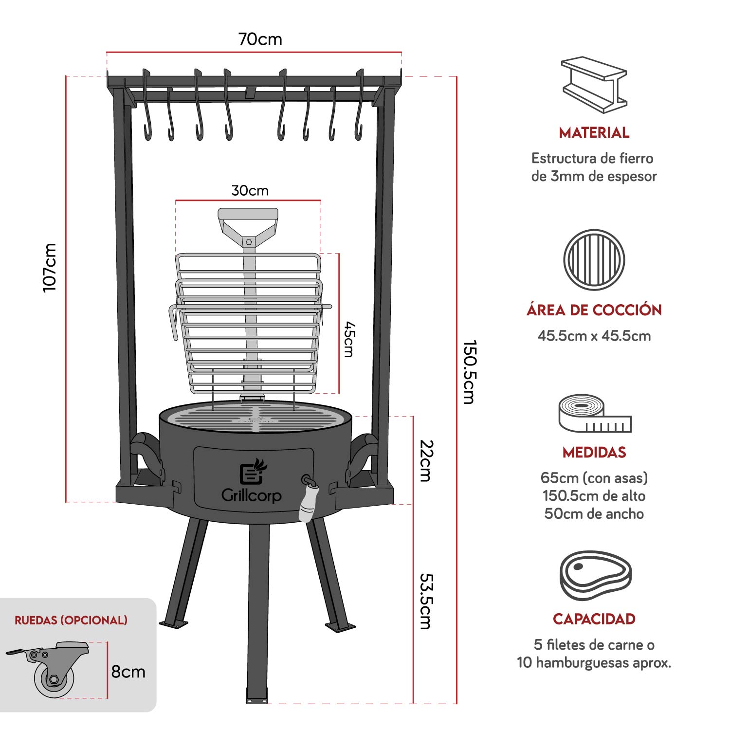 '- Incluye: 3 patas de fierro y 2 asas de fierro para ensamblar junto con la parrilla, Pala y atizador, una parrilla principal , una estaca inoxidable , 8 ganchos y Perchero de fierro.