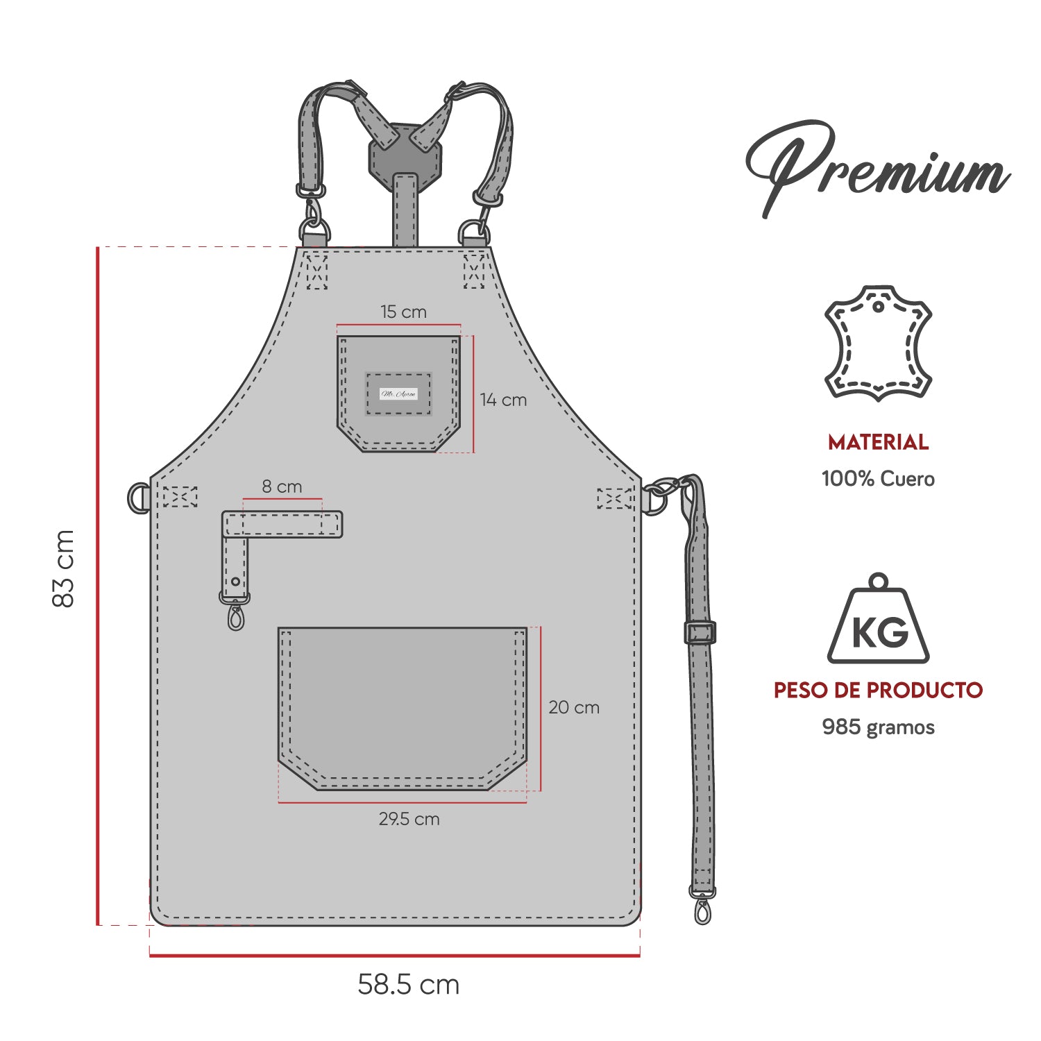 Sumérgete en el lujo y la comodidad con nuestro delantal de cuero premium. Fabricado con cuero de primera calidad, este delantal ofrece una sensación de lujo desde el primer momento. Sus correas cruzadas no solo añaden un toque de elegancia, sino que también distribuyen el peso de manera uniforme para un ajuste cómodo durante horas de uso. Los herrajes de lujo completan el diseño, agregando un toque de sofisticación y funcionalidad.