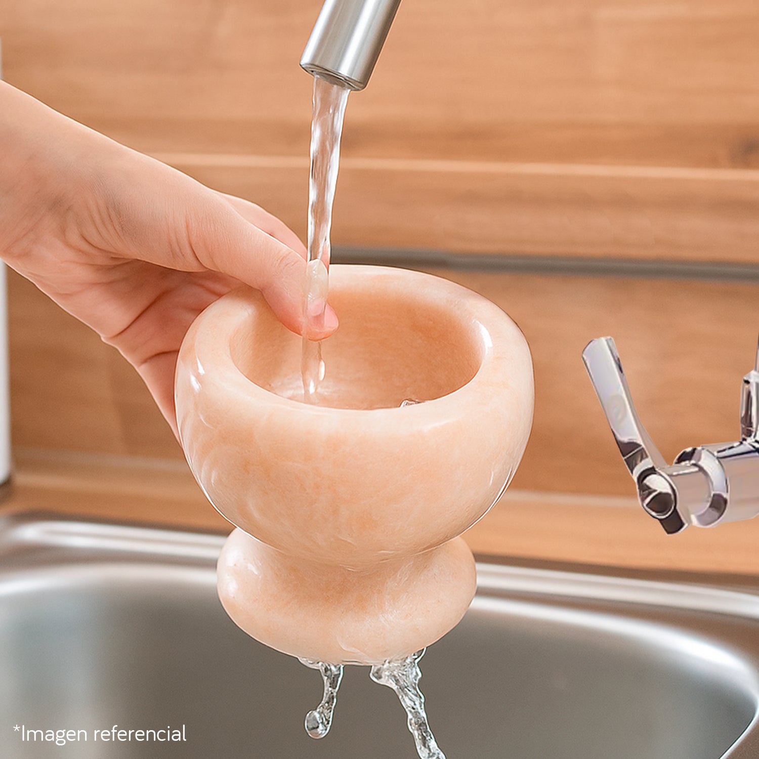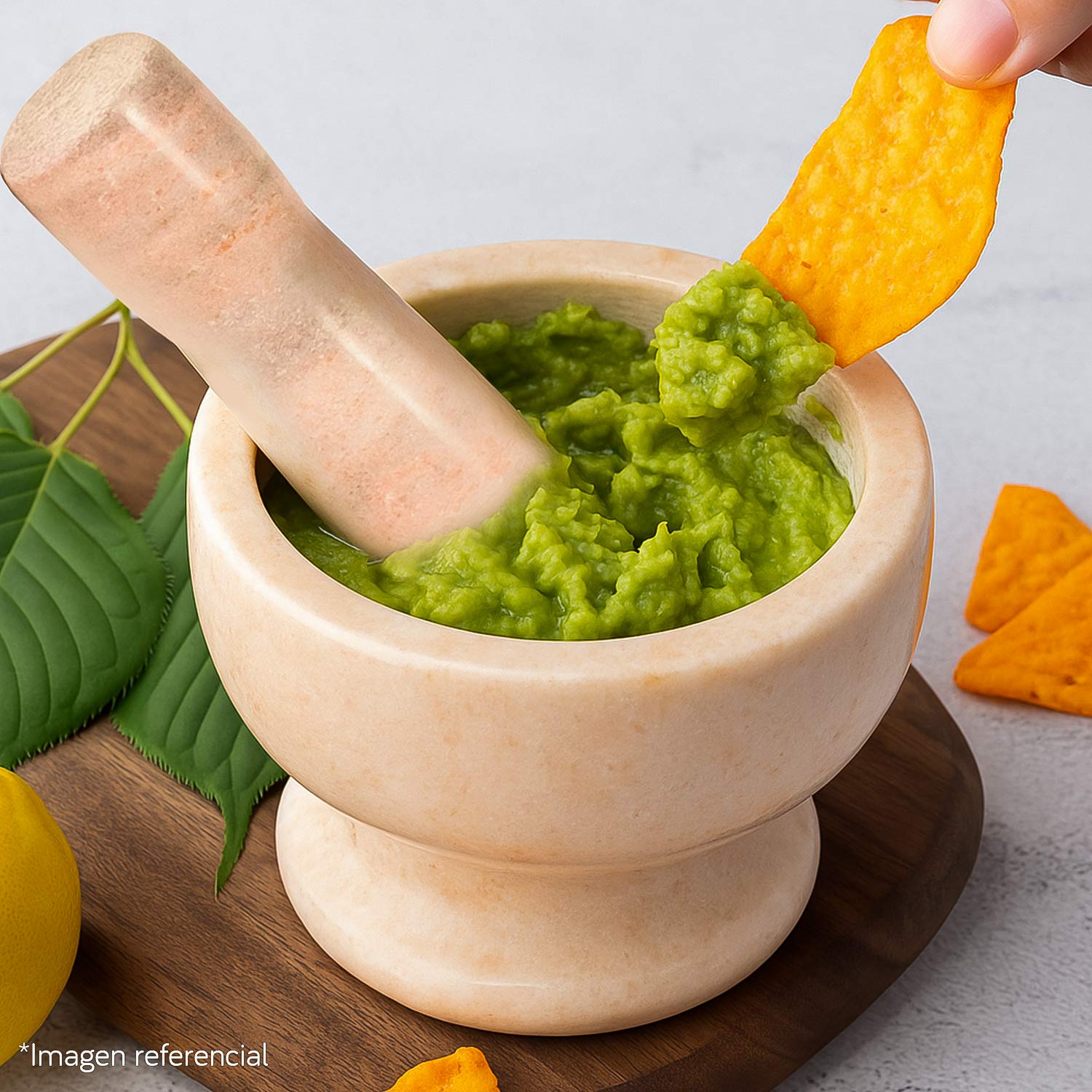 El mármol es un material natural altamente resistente al desgaste y a la presión constante del uso diario. A diferencia de morteros de madera o cerámica, este no se quiebra ni se astilla con facilidad. Su peso firme evita que se deslice mientras mueles, brindándote estabilidad y confianza en cada preparación.