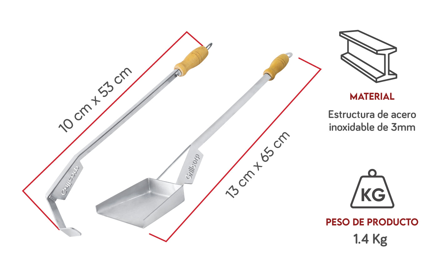 Evita accidentes al hacer tu parrilla. La pala y el atizador de aceor inoxidable te ayudarán a remover tu carbón sin la necesidad de acercarte mucho a las brasas. Ambos hechos de acero de 3mm de espesor, con un excelente acabado y con mangos ergonómicos de madera para su cómodo agarre.