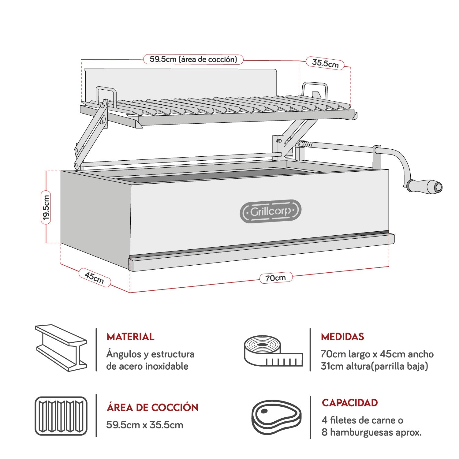 Parrilla Argentina Mediana Empotrable Inoxidable 70cm x 45cm | Grillcorp