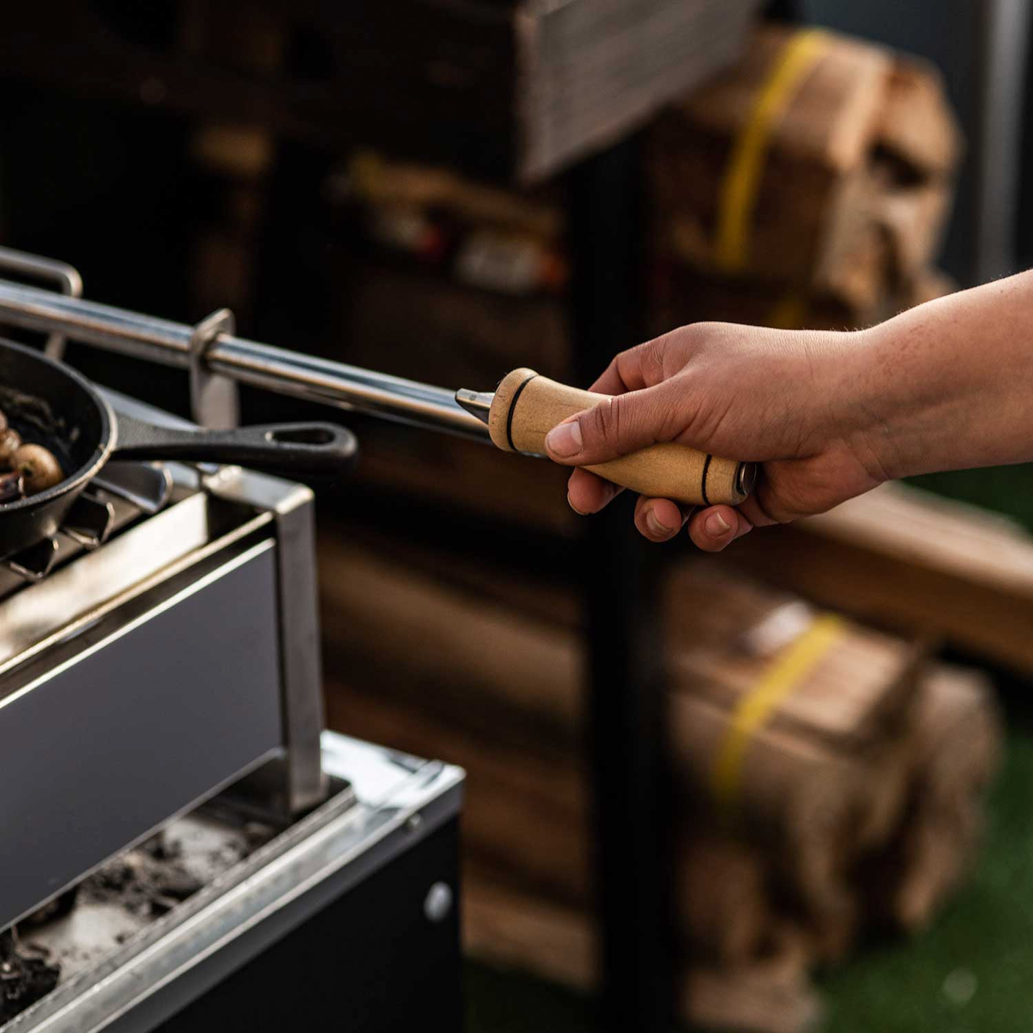 Cocina tus carnes y guarniciones con diferentes tiempos de cocción y temperaturas gracias al sistema de elevación, simplemente gira el mango y aléjalo o acercálo al fuego directo tanto como quieras o como te indique tu receta.