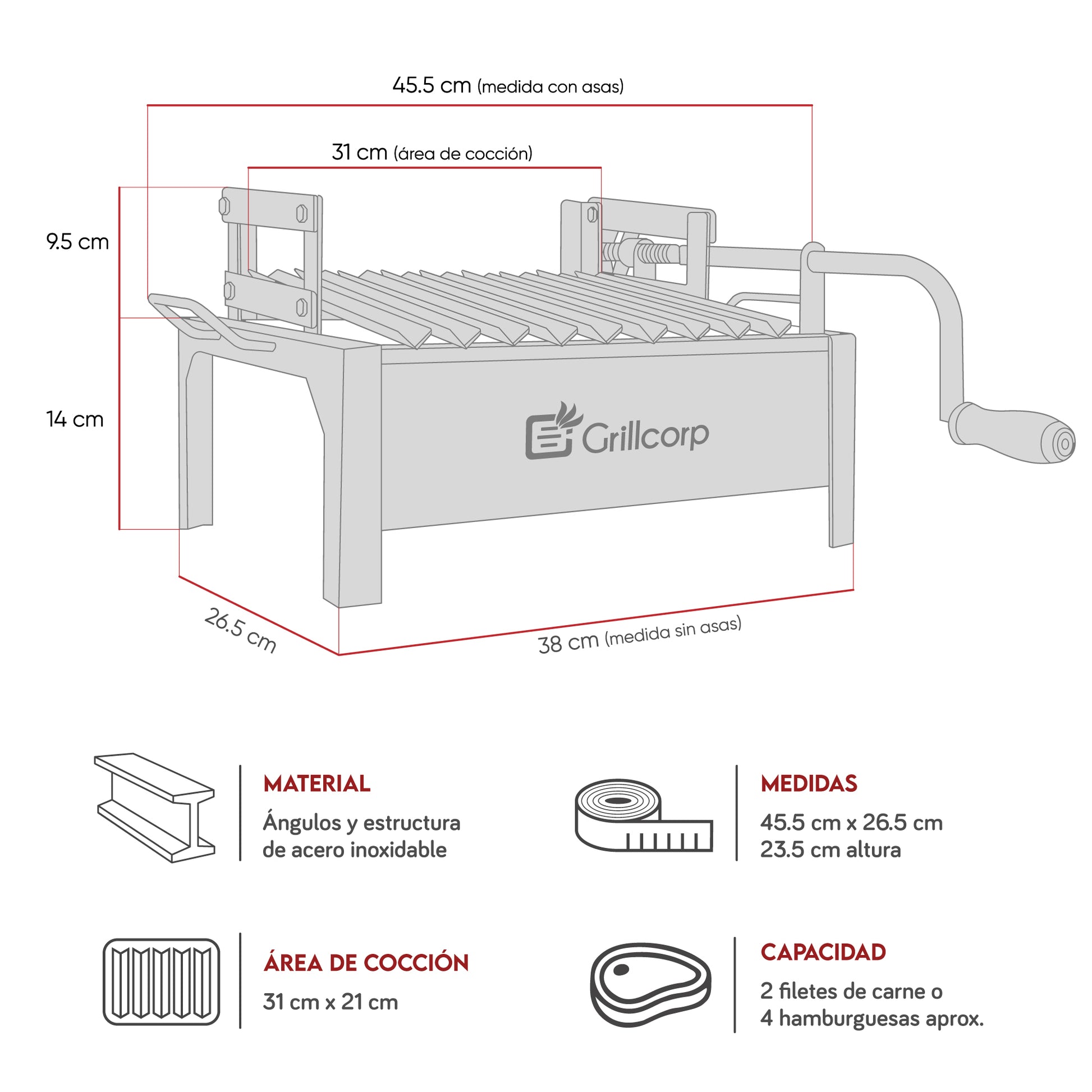 🔥 EFICIENTE SISTEMA DE ELEVACIÓN: Cocina tus carnes y guarniciones con diferentes tiempos de cocción y temperaturas gracias al sistema de elevación, simplemente gira el mango y aléjalo o acercálo al calor directo tanto como quieras o como te indique tu receta.