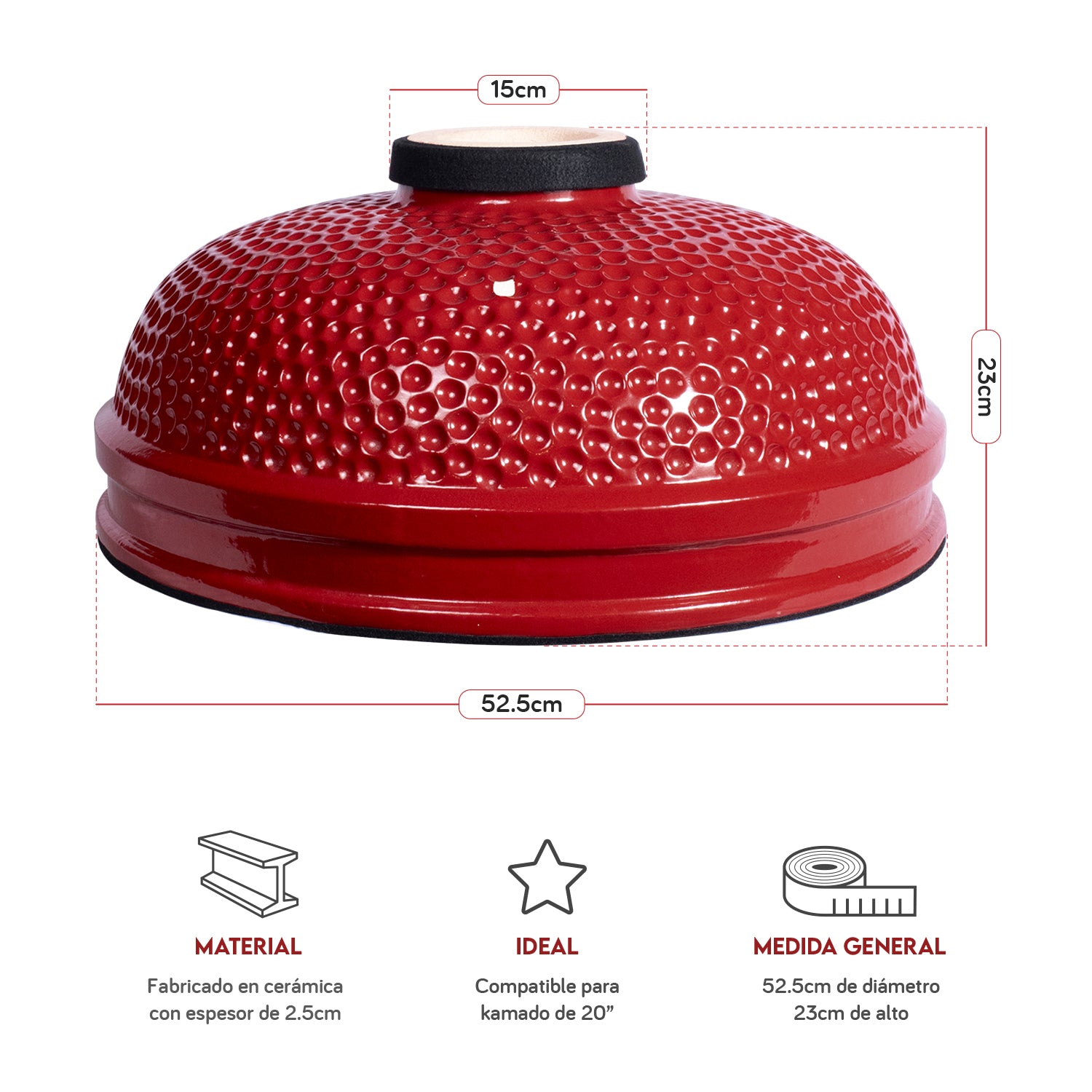Renueva tu kamado con esta tapa cerámica, diseñada para devolverle su eficiencia y apariencia original. Fabricada con cerámica de alta resistencia, esta tapa no solo es duradera, sino que también garantiza un sellado hermético que retiene el calor y el humo de manera excepcional, elementos clave para lograr resultados jugosos y llenos de sabor.