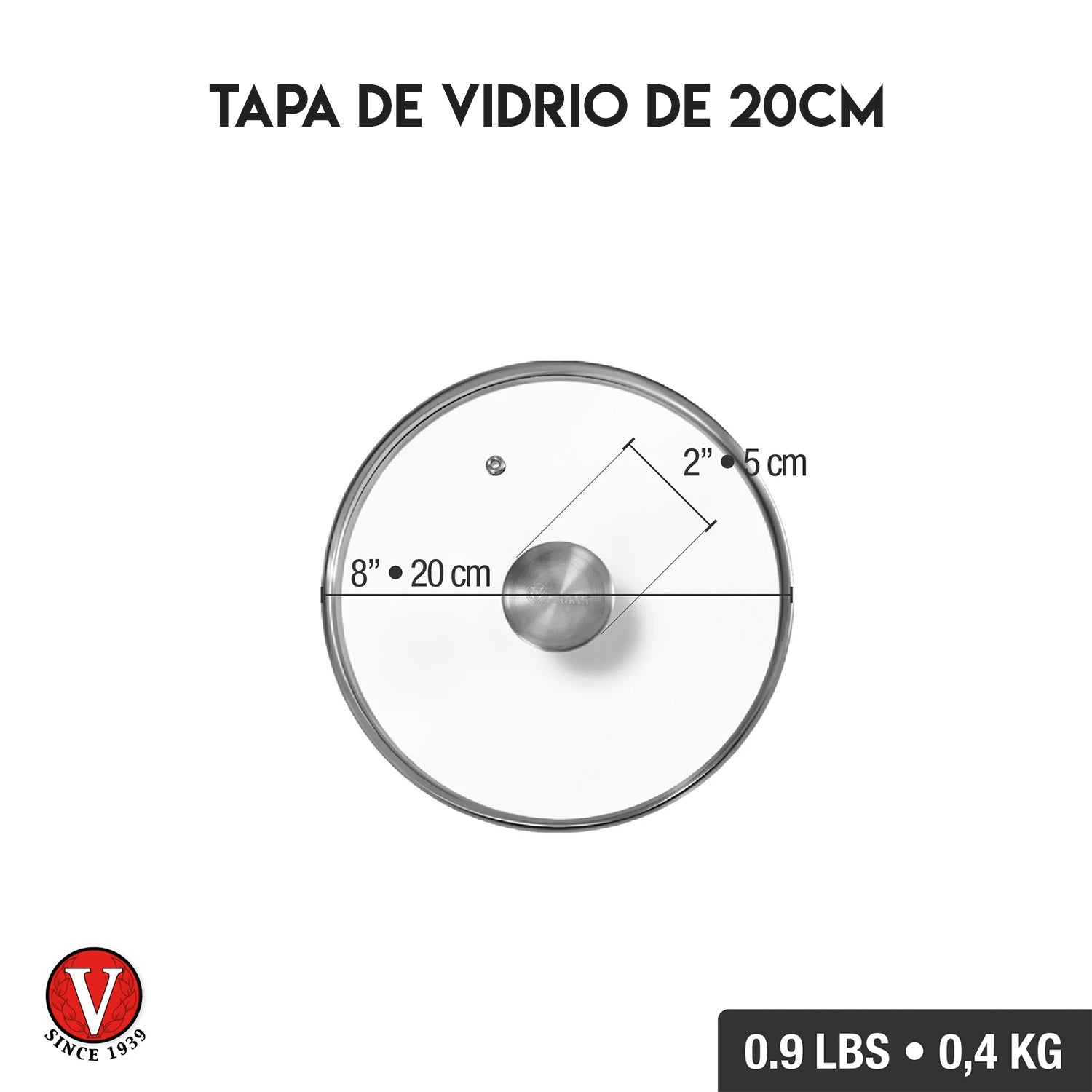 Es una tapa fabricada de vidrio templado transparente y con borde metálico de la marca Victoria, para ollas o sarténes, sirve para tapar éstas y asi concentrar el calor en su interior durante la cocción de los alimentos.