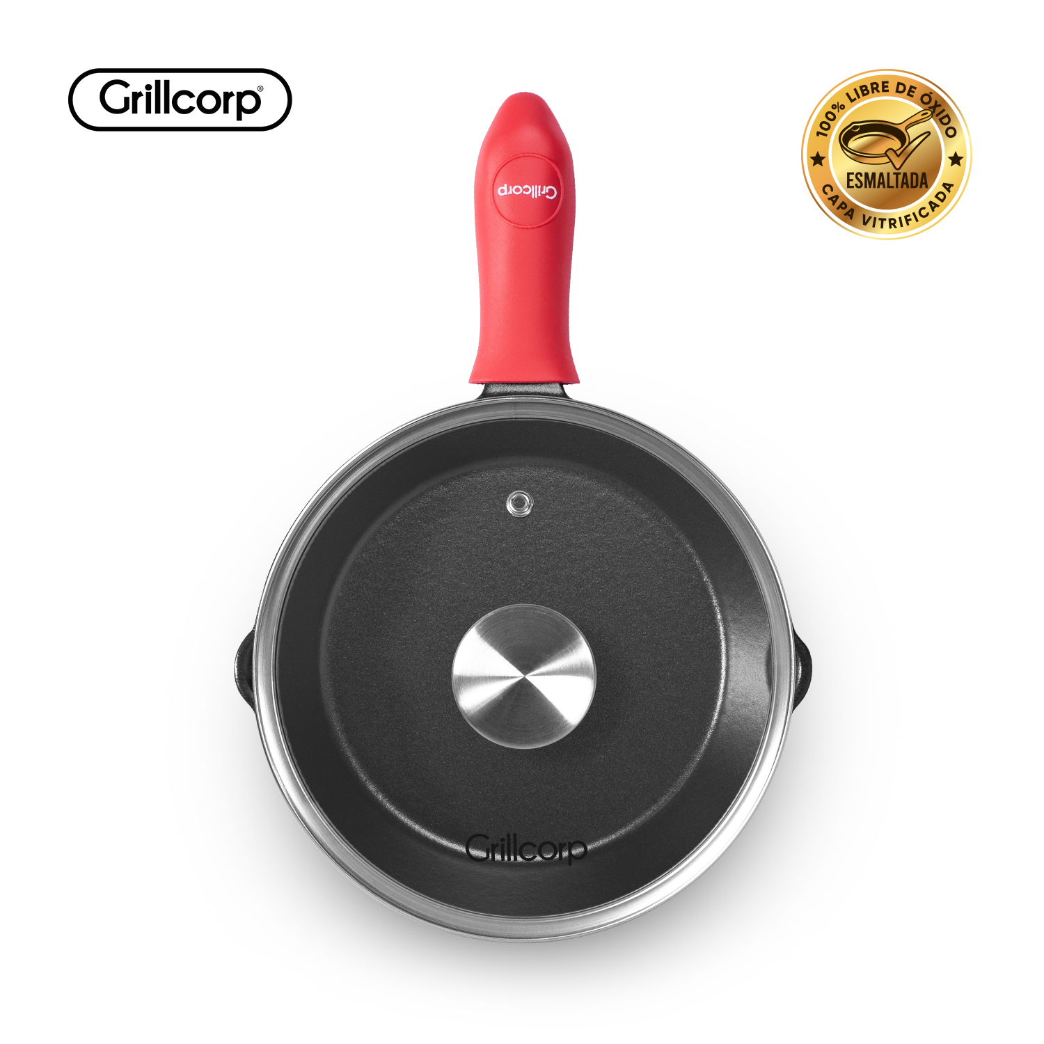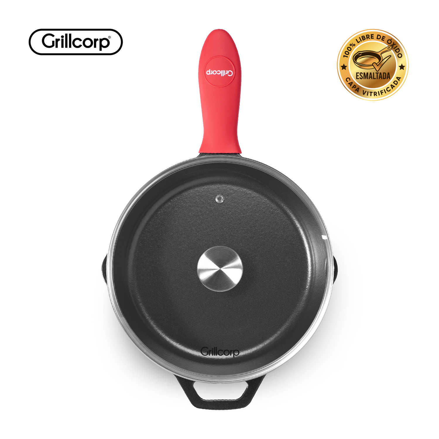 Sartén N° 25 de Hierro Fundido Esmaltado con Tapa de Vidrio y Mango de goma | Grillcorp